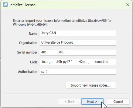 StataNow 19 SE starten und die Lizenzinfos, welche sich in der Lösung des vom Service Desk geöffnetes Tickets befinden, erfassen.